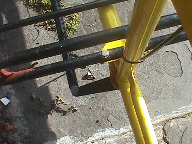 To a tab under the handle bars.